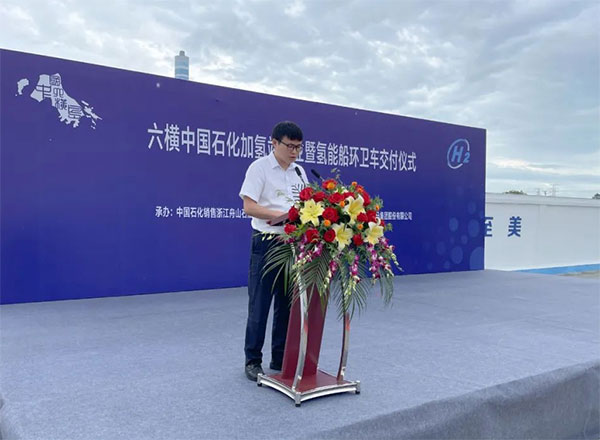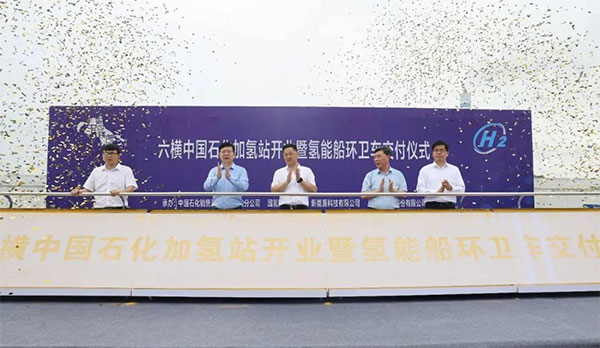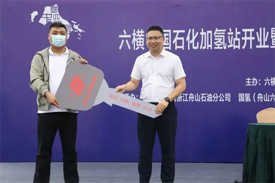 6月1日上午,六横中国石化加氢站开业暨氢能船、环卫车交付仪式在六横氢能产业园举行,管委会副主任吕辉及中国石化舟山石油分公司、人生就是博集团股份有限公司、深圳国氢新能源科技有限公司、国氢(舟山六横)新能源科技有限公司、浙江中创量云船舶科技有限公司等企业负责人共同为加氢站揭牌。